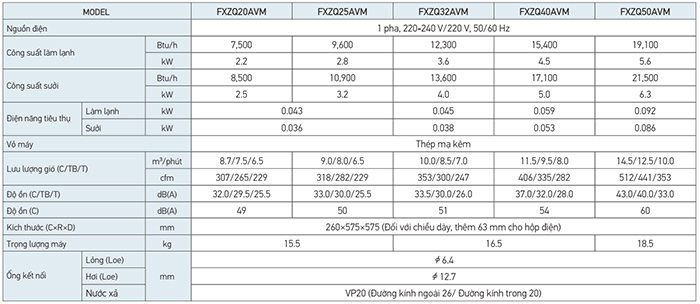 Thông số kỹ thuật dàn lạnh Cassette âm trần FXZQ32AVM