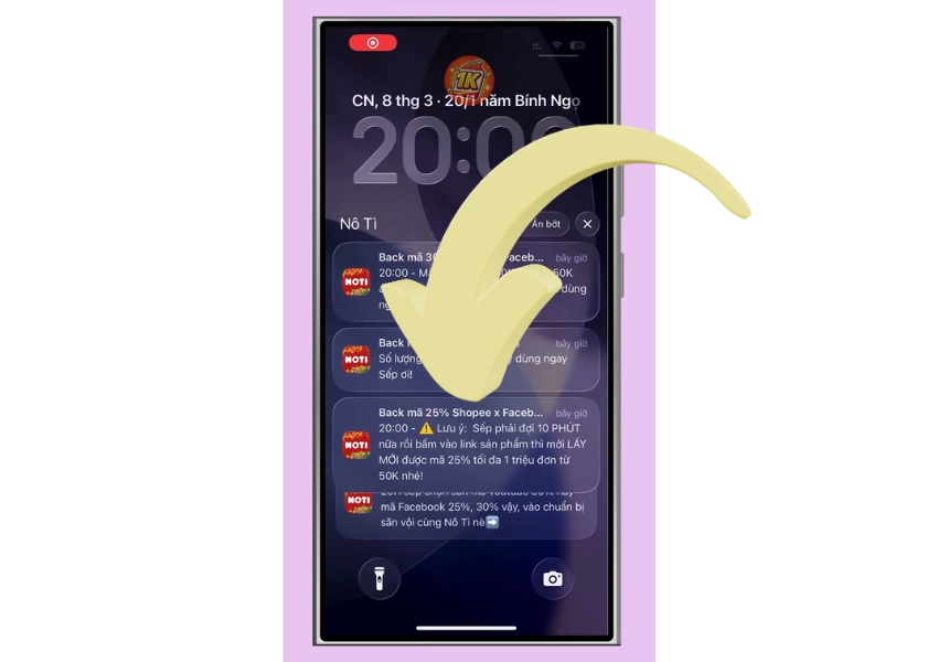 Các bạn để ý thông báo từ Nô Tì. Khi thấy thông báo như hình dưới các bạn nhìn kĩ xem sau khi back mã bao lâu thì có thể bấm vào link Facebook các bạn đã tạo ở bước 4 để lấy mã nhé. Ví dụ như thời điểm mình viết bài này là 20h00 back mã nhưng 20h10 mới có thể bấm vào link để lấy được mã 25% và sử dụng. Các thời điểm sau đó có thể thay đổi thành 20h05 hoặc 20h06. Vì vậy các bạn nhớ bật thông báo từ Nô Tì theo hướng dẫn ở Phần chuẩn bị và lưu ý đầu bài viết của mình nhé.